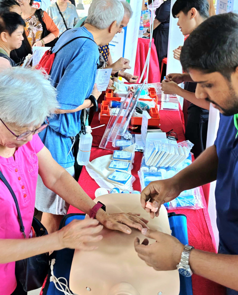 At the booth, residents tried identifying items from a first aid kit and practised bandaging an injured arm. These were situations they could easily imagine happening at home, which made the learning feel more approachable.