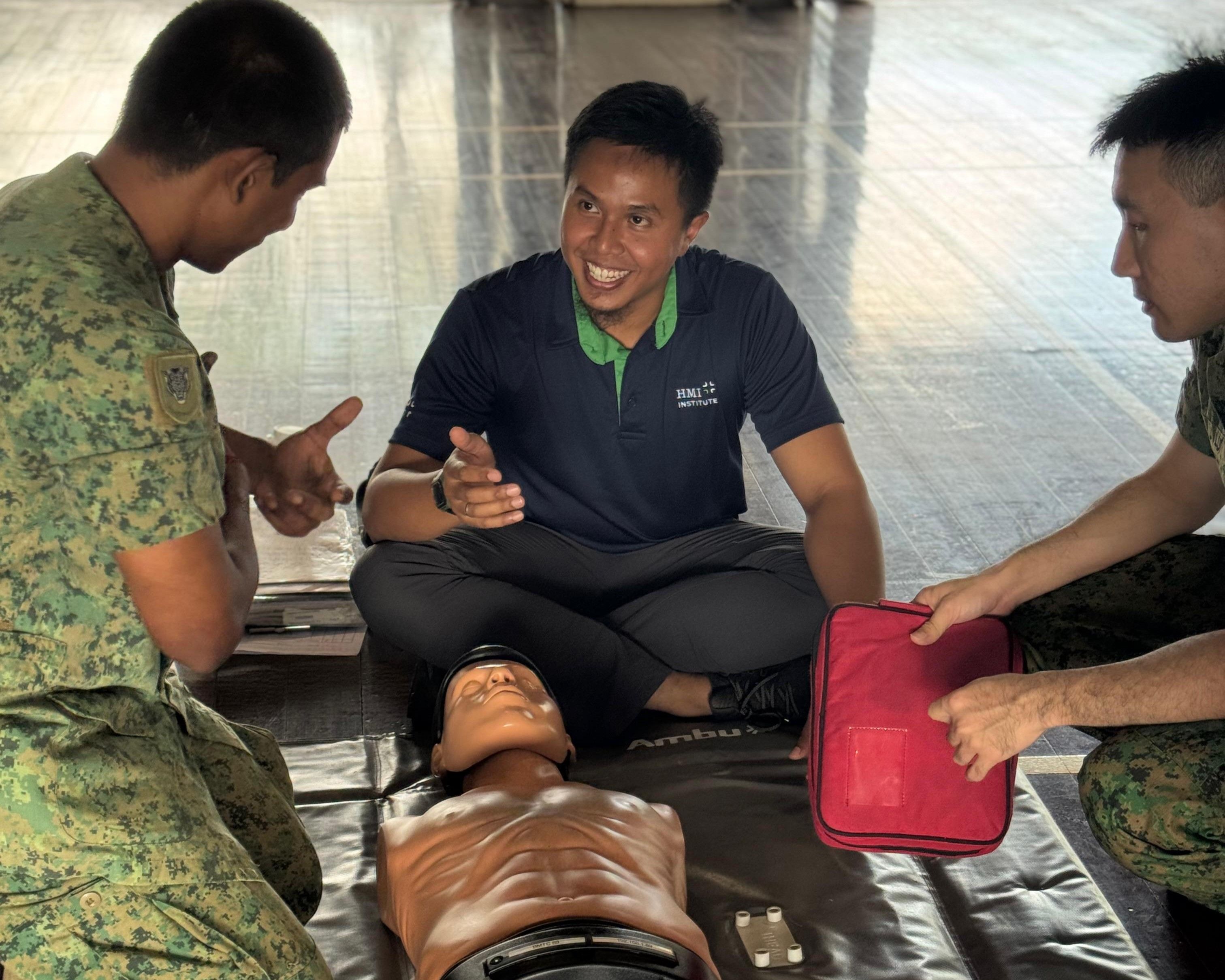 Photo: Community member learning adult CPR techniques guided by HMI Institute’s instructors, promoting emergency response skills